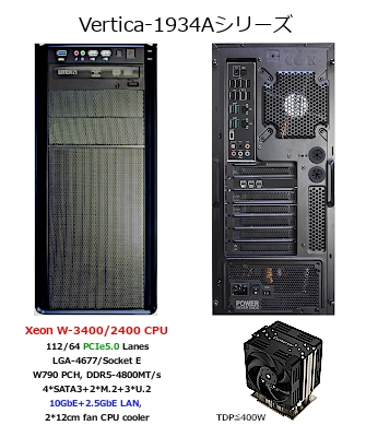 (ミドルタワー, Xeon W-3400 112レーン/W-2400 64レーンLGA-4677 CPU, プッシュプル方式CPUファン, Intel W790 PCH, 3*PCIe5.0(X16)バス, DDR5 ECC RDIMM, 2*M.2 NVMe SSD, 3*U.2 NVMeデバイス, 1*10GbE+1*2.5GbE, 850W 80Plus ゴールド規格 ATXプラグイン方式電源)