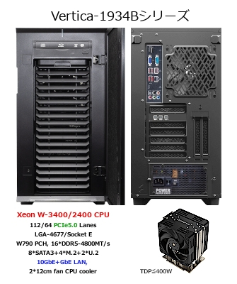 Vertica-1934Bシリーズは、LGA-4677ソケット(ソケットE)Intel Xeon W-3400(112レーン)CPU及びIntel Xeon W-2400(64レーン)CPUが搭載可能な高性能ワークステーションで、Windows系OSをはじめ、幅広いLinux系OSでの動作をサポートしています。8