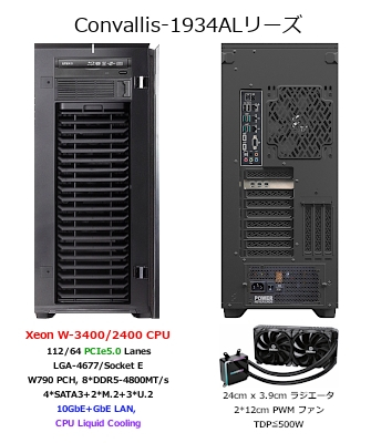 Convallis-1934ALシリーズおよびConvallis-1934BLシリーズは、LGA-4677ソケット(ソケットE)Intel Xeon W-3400(112レーン)CPU及びIntel Xeon W-2400(64レーン)CPUを簡易水冷ユニットで冷却し、静音性と安定性を向上したワークステーションです。
