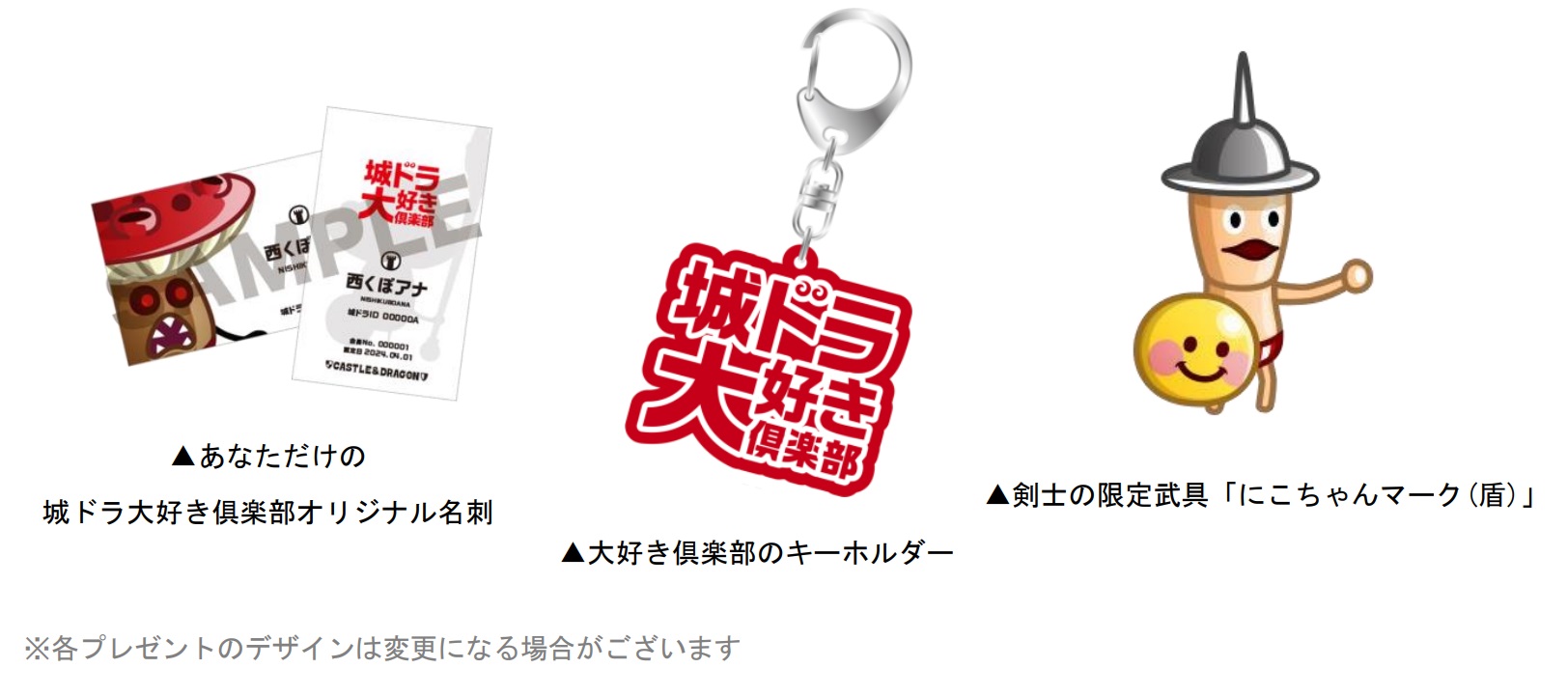 来場された全員に、「あなただけの城ドラ大好き?楽部オリジナル名刺」や「大好き倶楽部のキーホルダー」、さらにゲーム内の剣士の限定武具「にこちゃんマーク(盾)」をプレゼント!オフ会に参加して、お友達にお着替えを自慢しちゃいましょう!