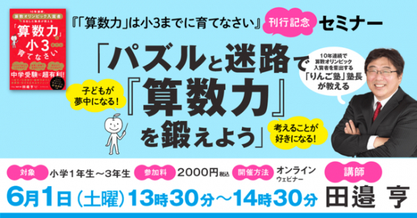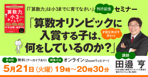 本書では、彦根という小さな町で生まれた「りんご塾」がいかにして天才児を生み出してきたのか、「りんご塾」代表の田邉亨先生がそのメソッドを大公開。すぐに実践できる具体的なアドバイスが満載の、小学3年生までの子どもを持つ親なら必読の1冊です。発売を記念して、5月と6月に田邉先生によるオンラインセミナーも開催します。