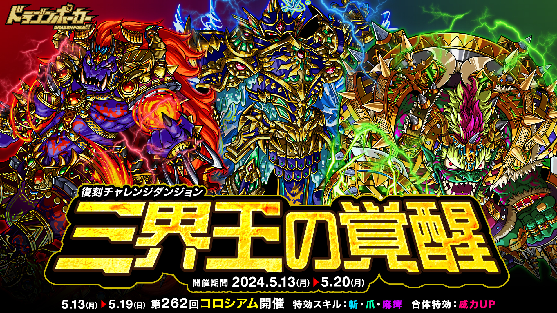 株式会社アソビズム(本社:東京都千代田区、代表取締役:大手智之)は、App Store・Google Playにて好評配信中のリアルタイム合体カードバトル『ドラゴンポーカー』で、2024年5月13日(月)より復刻チャレンジダンジョン「三界王の覚醒」を開催いたします。