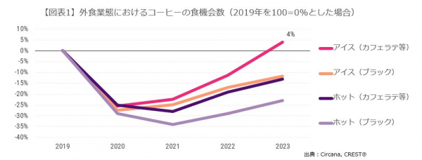 外食業態計でアイスカフェラテ等は、コロナ前比4%増