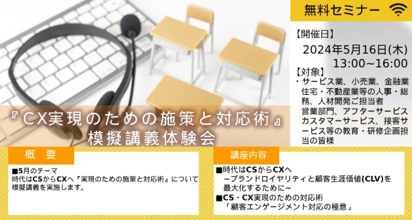 株式会社マネジメントサポートグループ(本社:東京都港区、代表取締役:古谷治子、資本金:2,000万円)は、『~時代はCSからCXへ~CX実現のための施策と対応術』を2024年5月16日(木)13:00~無料オンラインセミナーで開催します。