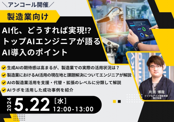 2024年5月22日(水)、株式会社トリプルアイズ(本社:東京都千代田区、代表取締役:山田 雄一郎、東京証券取引所グロース市場《証券コード:5026》、以下トリプルアイズ)は、製造業対象の無料ウェビナー「AI化、どうすれば実現!? トップAIエンジニアが語るAI導入のポイント」を開催いたします。