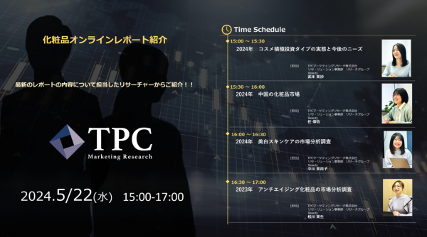 リサ・リューション事業を展開するTPCマーケティングリサーチ株式会社(代表取締役社長:松本 竜馬)は、2024年5月22日に化粧品オンラインレポート紹介を開催いたします。