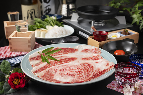 当店でご提供するすき焼きは、A5ランクの仙台牛のみを使用した、上セット(サーロイン90g)・特上セット(リブロース120g)の2種類のセット。上、特上ともに、あまり動かないため柔らかい腰の部位を用い、口の中でとろけるような質感が自慢です。
