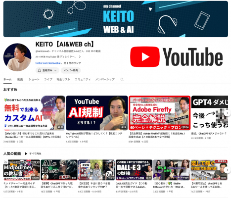 KEITO【AI&WEB ch】として332本の生成AI関連の番組配信とチャンネル登録者数6.6万人の実績を持つ生成AI 系のYouTuberでありインフルエンサー。