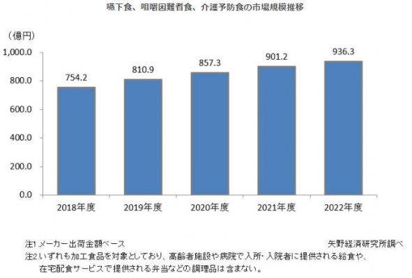 介護予防食市場は、低栄養を予防・改善する手段として、高齢者施設入居者の補食(おやつ・デザート)需要として安定的に伸びている。但し、物価高騰に伴う食品全般の値上げを受け、限られた予算内では主菜や副菜が優先されるため、優先度の低い介護予防食は使用頻度が減らされるなどの動きが見られる。この食品全般の値上げ次第で、今後の介護予防食は市場拡大が鈍化することも考えられる。