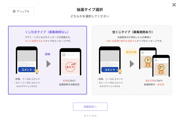 インスタントウィン方式のくじ引きタイプと当落選日の日時を設定する宝くじタイプから選択可能。