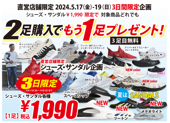 ▲5月17日-19日 店舗限定企画 新作サンダル・人気のシューズ2足ご購入で「3足目無料セール」を開催します。