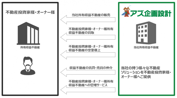 不動産投資家様や不動産オーナー様が抱える収益不動産の購入ニーズに対して、当社収益不動産の販売や仲介のご支援、収益不動産売却ニーズに対して、当社にて買取や仲介のご支援をしてまいります。また、ご所有される収益不動産に対する空室や管理面での課題に対して、空室の借上げや管理受託にも取り組み収益不動産の様々な課題に対して経営の安定化をご提案いたします。