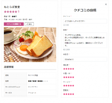 ねとらぼの人気コンテンツのひとつであるランキング情報に対し、会員がお店のクチコミレビューを投稿できるようになります。クチコミレビューでは、「満足度」だけでなく、「料理・味」「サービス」「雰囲気」「コストパフォーマンス」「酒・ドリンク」と細かい観点で評価が可能です。1投稿につき、画像を10枚までアップロード可能で、投稿いただいたクチコミは事務局が確認した上で公開されます。