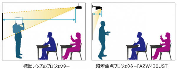 優れた特長を持つAZW430USTは、学校教室の黒板や会議室のホワイトボードの上部への常設はもちろん、店舗映像やデジタルサイネージにも適します。またDLPプロジェクターならではのコンパクトかつ軽量(4.5kg:本体+ACアダプター)設計のため、持ち運びも容易、卓上に置いて手軽に映像を楽しむホームユースにも活用できる1台です。