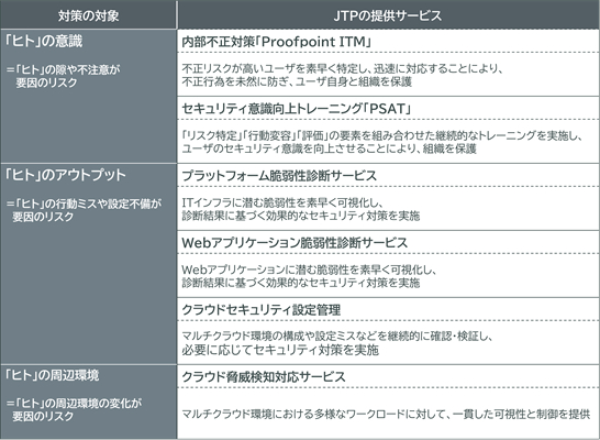 JTPでは、「ヒト」に起因するセキュリティリスクに対して多角的にアプローチするセキュリティ対策ソリューションを展開しており、お客様のニーズにワンストップで対応しています。