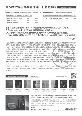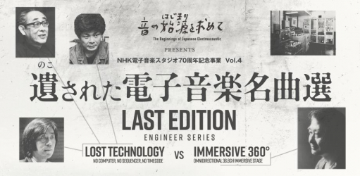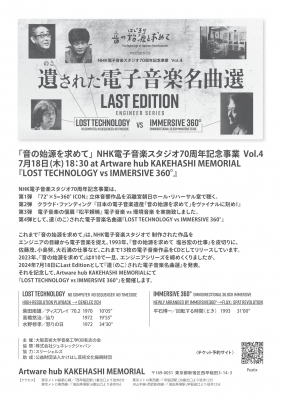 これまで「音の始源を求めて」は、NHK電子音楽スタジオで 制作された作品をエンジニアの目線から電子音楽を捉え、1993年、『音の始源を求めて塩谷宏の仕事』を皮切りに、佐藤茂、小島努、大石満の仕事など、これまで13枚の電子音楽作品をCDとしてリリース。2023年、「音の始源を求めて」は#10で一旦、 エンジニアシリーズを締めくくりましたが、7/18にLast Editionとして「遺(のこ) された電子音楽名曲選」を発表。それを記念してArtware hub KAKEHASHI MEMORIALにて「LOST TECHNOLOGY VS IMMERSIVE 360°」を開催!