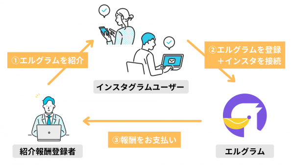 紹介報酬登録者が発行した紹介用リンクから、ユーザーが「エルグラムに登録 かつ インスタグラムと連携」すると、紹介者に報酬が発生します。