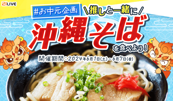 株式会社エムアンドティーティー(本社:沖縄県北谷町、代表取締役:井藤 三知子)が運営するエンターテイメント・ライブ配信アプリ【21LIVE(ニーイチライブ)】URL: https://21.live では、6月1日(土)よりお中元企画を開催。3万GOLDを達成したライバー全員に沖縄そばをプレゼントいたします。