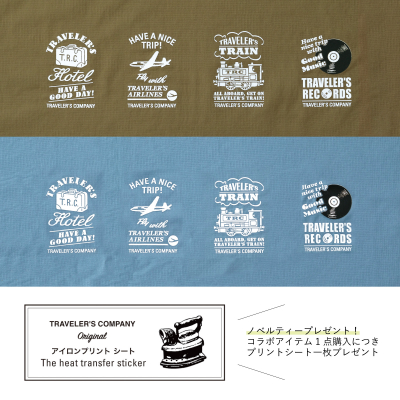 トラベラーズxTO&FROのコラボ商品(トラベラーズノートを除く)をお買い上げの方に、お買い上げ1点につき1枚、トラベラーズカンパニーのデザインによるアイロンプリントシート(プリントサイズ縦31mm×横47mm)をプレゼントいたします。新作のボストンバッグや、オーガナイザーなどにアイロンで転写でき自分だけのオリジナルが作成できます。