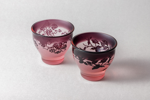 サンドブラストとは、硬くて細かい砂(金剛砂など)を高圧で吹き付けガラスなど素材の表面を削り取ることでデザインを表現する技法。もとは工業用の錆落としとして1870年アメリカで開発され、当時はショットブラストと呼ばれ、20世紀に入って美術工芸用として改良されたのがサンドブラストです。日本には明治末頃に入ってきました。