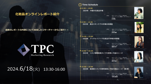 リサ・リューション事業を展開するTPCマーケティングリサーチ株式会社(代表取締役社長:松本 竜馬)は、2024年6月18日に化粧品オンラインレポート紹介を開催いたします。