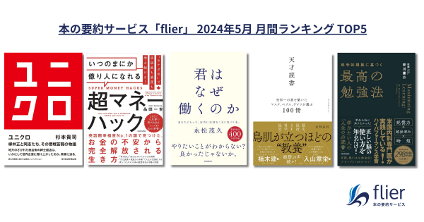 累計会員数116万人を突破した本の要約サービス「flier(フライヤー)」を運営する株式会社フライヤー(本社:東京都千代田区、代表取締役CEO 大賀康史)は、2024年5月のビジネス書月間ランキングを発表しました。