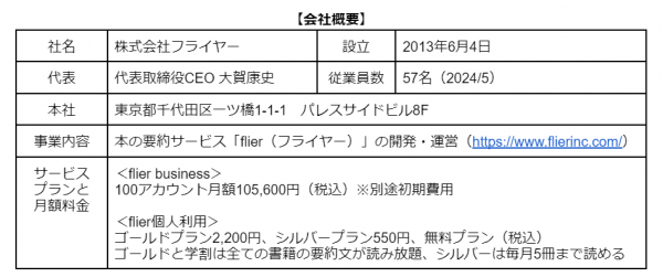 株式会社フライヤーは、本の要約サービス「flier(フライヤー)」を運営する、ITベンチャー(2013年6月設立)です。最大の特長は「書評(レビュー)」ではなく「要約」である点です。書き手の主観が入る書評とは異なり、著者の主張や論理(重要ポイントや全体像)を忠実にまとめ、読者に伝えます。書評でないため、出版社と著者から要約の許可を得る必要があり、要約した原稿にも目を通していただくことで、高品質なサービスを提供しています。