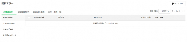 配信上限超えといったエラー原因や再送済み履歴なども閲覧可能です。