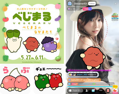 エイノバ株式会社(本社:東京都千代田区、代表取締役社長:安倍義人)がマネジメントするクリエイター「うめぼしちゃん」が描く人気キャラクター「べじまる」とライブ配信アプリ「17LIVE(イチナナ)」が2024年5月27日(月)よりアプリ内でコラボイベントを開催しました。