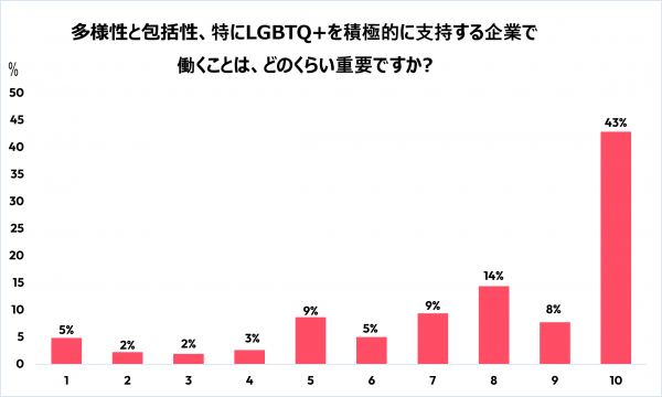 多様性と包括性、特にLGBTQ+を積極的に推進する企業で働くことの重要度を回答者が1~10の10段階で評価した結果、43%が多様性と包括性に富んだ企業で働くことが非常に重要であるという「10点」の評価をしました。反対に、まったく重要でないという評価したのはわずか5%で、多様性と包括性の重要性を理解し推進する企業が好まれる傾向があることが明らかとなりました。