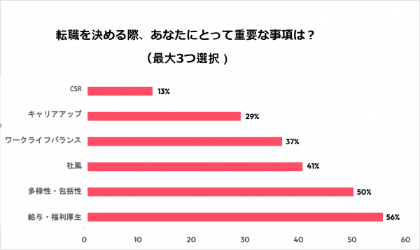 転職の際の入社を決める優先事項は1位「給与と福利厚生」(56%)、2位「多様性と包括性」(50%)、3位「社風」(41%)でした。