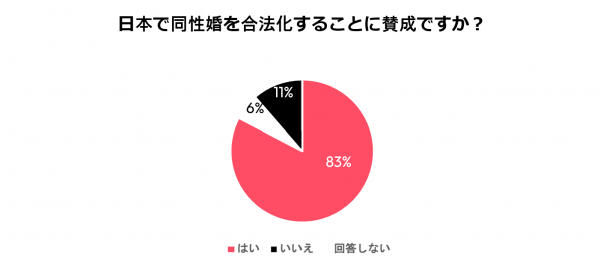 回答者の8割以上(83%)が、日本における同性婚の合法化を支持すると表明しました。この結果は、国際レズビアン・ゲイ協会(ILGA)の調査結果とも一致し、世界的にLGBTQ+の権利が広く受け入れられ、推進されていることを示しています。.