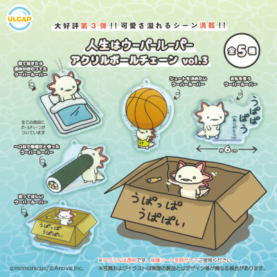 「人生はウーパールーパー」はSNS総フォロワー数が17.5万人を超える人気キャラクター。今回はSNSに投稿された「人生はウーパールーパー」のイラストの中で人気のイラストなどを全5種で展開。かわいいだけでなく、くすっと笑えるイラストに癒されるアイテムとなっています。アクリルボールチェーンは好評につき3回目のカプセルトイ化となります。カバンやポーチに付けて楽しんでください♪