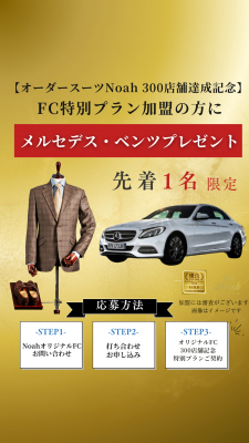 【オーダースーツNoah メルセデス・ベンツをプレゼント企画を開始!300店舗突破を記念した特別プランを発表】
