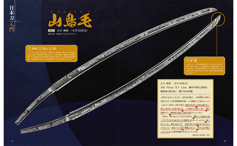特集「日本刀入門」の一振目は上杉の至宝「山鳥毛」。備前長船刀剣博物館に実際に展示されていたキャプションから、見るべきポイントやキャプション内の用語を詳しく解説します。