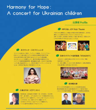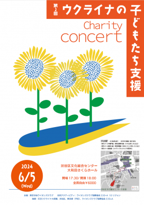 東京渋谷ライオンズクラブ主宰・第10リジョン合同アクティビティとして開催されるこのコンサートには、ウクライナ出身のオペラ歌手、オクサーナ・ステパニュックさんをはじめ、日本ウクライナ友好協会KRAIANY、NPO法人JOY Kid's Theaterになどが出演し、歌と演奏、ダンスによるパフォーマンスが行われます。また、ポーランドでウクライナ難民の支援活動を行っている坂本龍太朗氏とリモートで繋ぎ、現地の様子をリアルタイムで報告します。