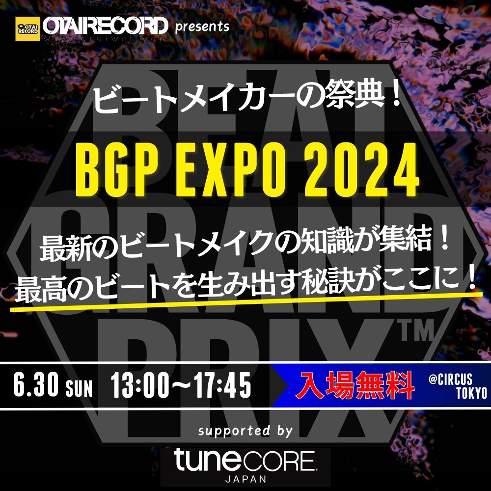 オタイオーディオ株式会社が運営するDJ機材、作曲機材専門店のOTAIRECORD(オタイレコード)が主催する日本最大級のビートメイク・作曲の大会「ビートグランプリ」が、トラックメイカー・ビートメイカーの祭典「ビートグランプリ EXPO 2024」を 6 月 30 日(日)に渋谷 Club Circus Tokyo にて開催する事が決定。