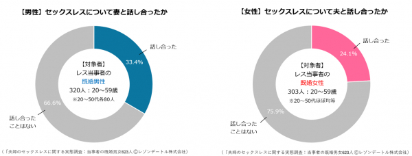 結果は、男性の66.6%、女性の75.9%がこれまで「話し合ったことがない」というものでした。「話し合ったことがある」と回答したのは男性33.4%、女性24.1%のみで、レス当事者の大半が夫婦間でレスの問題に向き合えていないことが分かります。