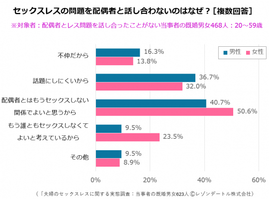 夫婦でレスの問題を話し合わない理由は何でしょうか、尋ねてみました。すると、「配偶者とはもうセックスしなくてよい」という回答が最多で、男性の4割以上、レス女性の5割以上となりました。