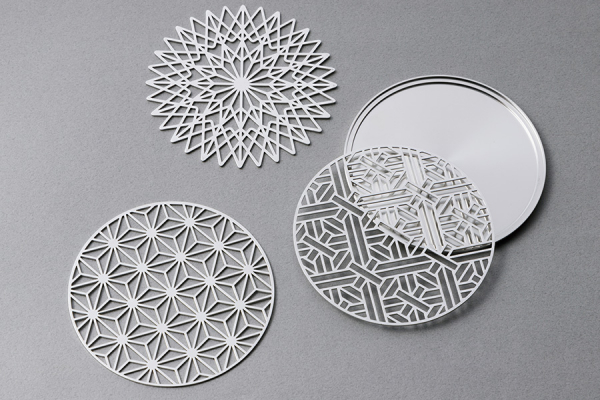 多彩な柄を持つコースタートップとスタッキング可能なコースターベース。繊細な幾何学模様・伝統紋様のデザインは、驚異の正確性で加工できる熟練された職人技があってこそ。2つを組み合わせて利用することで水滴がベースに溜まる構造となり、ご自宅や店舗の木製天板上などでも安心してご利用できます。スタイリッシュな箱もご用意していますので、ギフトにもおすすめです。