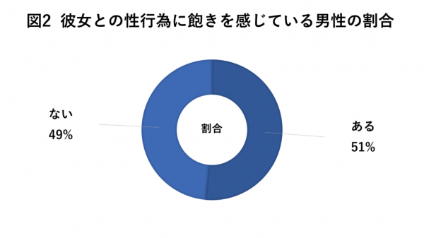 結果、飽きたことがあると回答した男性は51%に対して、飽きたことがないと回答した男性は49%。彼女との性行為に飽きたことがある男性と飽きたことがない男性はハーフアンドハーフ。