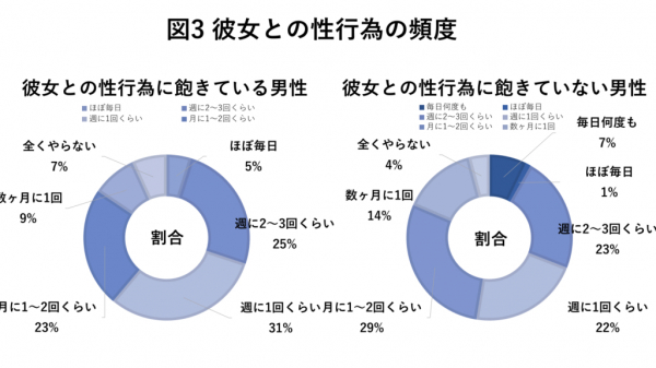 続いて、「彼女との性行為の飽きている男性」と「彼女との性行為に飽きていない男性」それぞれの彼女との性行為の頻度についてリサーチしました。