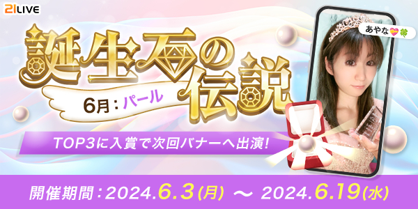 株式会社エムアンドティーティー(本社:沖縄県北谷町、代表取締役:井藤 三知子)が運営するエンターテイメント・ライブ配信アプリ【21LIVE(ニーイチライブ)】URL: https://21.live では、6月3日(月)より定期イベント「誕生石の伝説」を開催。指定アイテム・パールの獲得数で上位入賞したライバーにはバナー出演権や配信初期値ボーナスを進呈いたします。