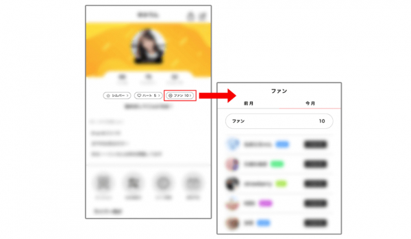 前月または今月にファンが1人以上いる場合、マイページに人数が表示され、タップでファンリストを確認することが出来ます。