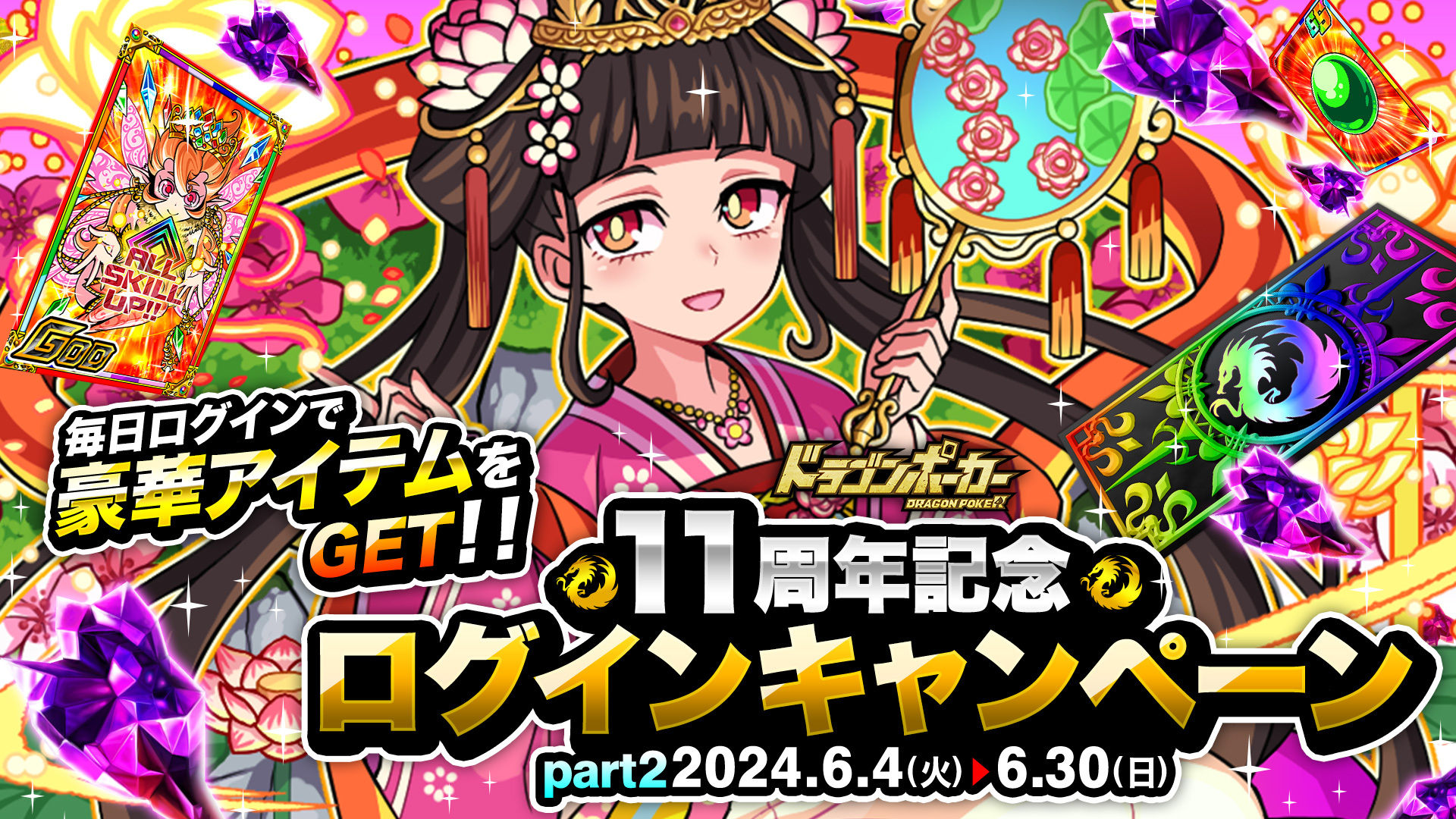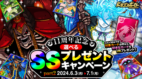 おかげさまで『ドラゴンポーカー』は、2024年5月17日(金)にサービス開始11周年を迎えました。これを記念し、6月3日(月)より「11周年超猛烈究極大感謝祭(後半)」を開催いたします。好きなSSキャラが必ずもらえる「選べるSSプレゼントキャンペーン」や、毎週末SSレアガチャチケットがもらえる「11周年記念週末お楽しみプレゼント」など、前半に引き続き様々なキャンペーンを開催いたします。「11周年超猛烈究極大感謝祭(後半)」もどうぞお楽しみください!