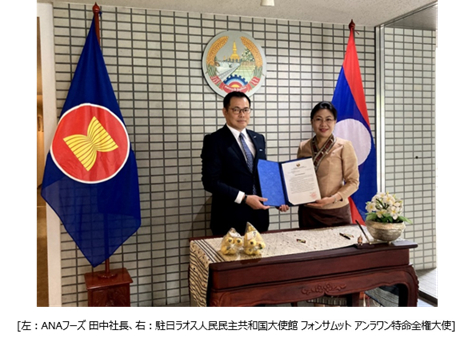 ANAフーズ株式会社(本社:東京都港区、代表取締役社長:田中久敬、以下ANAフーズ)は、2024年5月7日、駐日ラオス人民民主共和国大使館 フォンサムット アンラワン特命全権大使より、日本におけるラオス産バナナの普及について、感謝と支援の書面を拝受しました。