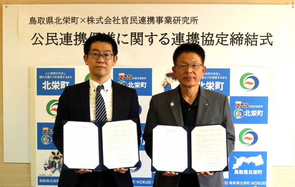 (写真:左から、株式会社官民連携事業研究所 代表取締役社長 鷲見 英利、北栄町 手嶋 俊樹 町長)