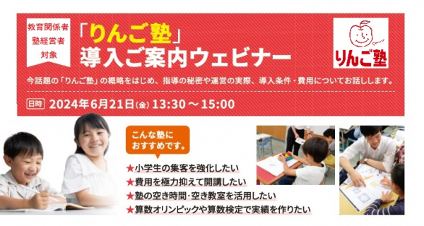 株式会社城南進学研究社(本社:神奈川県川崎市、代表取締役社長CEO:下村 勝己。以下「当社」)が運営する、算数オリンピック対策に特化した専門塾「りんご塾」は、2024年6月21日(金)に「りんご塾」導入ご案内ウェビナーを開催します。