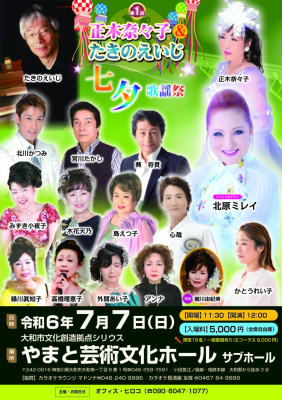 「正木奈々子&たきのえいじ 七夕歌謡祭」は初開催となり、ステージには正木奈々子氏、宮川たかし氏、葵将貴氏、島えつ子氏、北川かつみ氏、高橋理恵子氏、木花天乃氏などプロの歌手が出演する歌謡祭となっております。