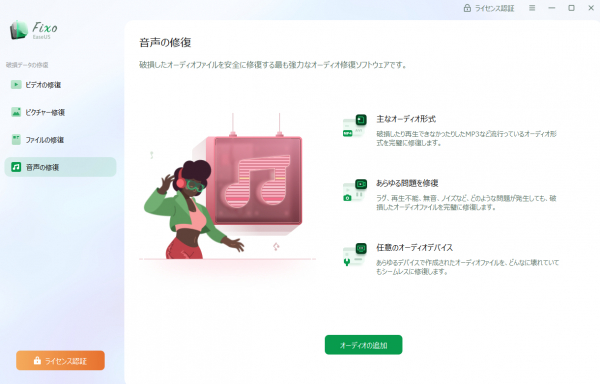 Step 1.「音声の修復」で「オーディオの追加」を選択し、破損したMP3ファイルを追加します。
